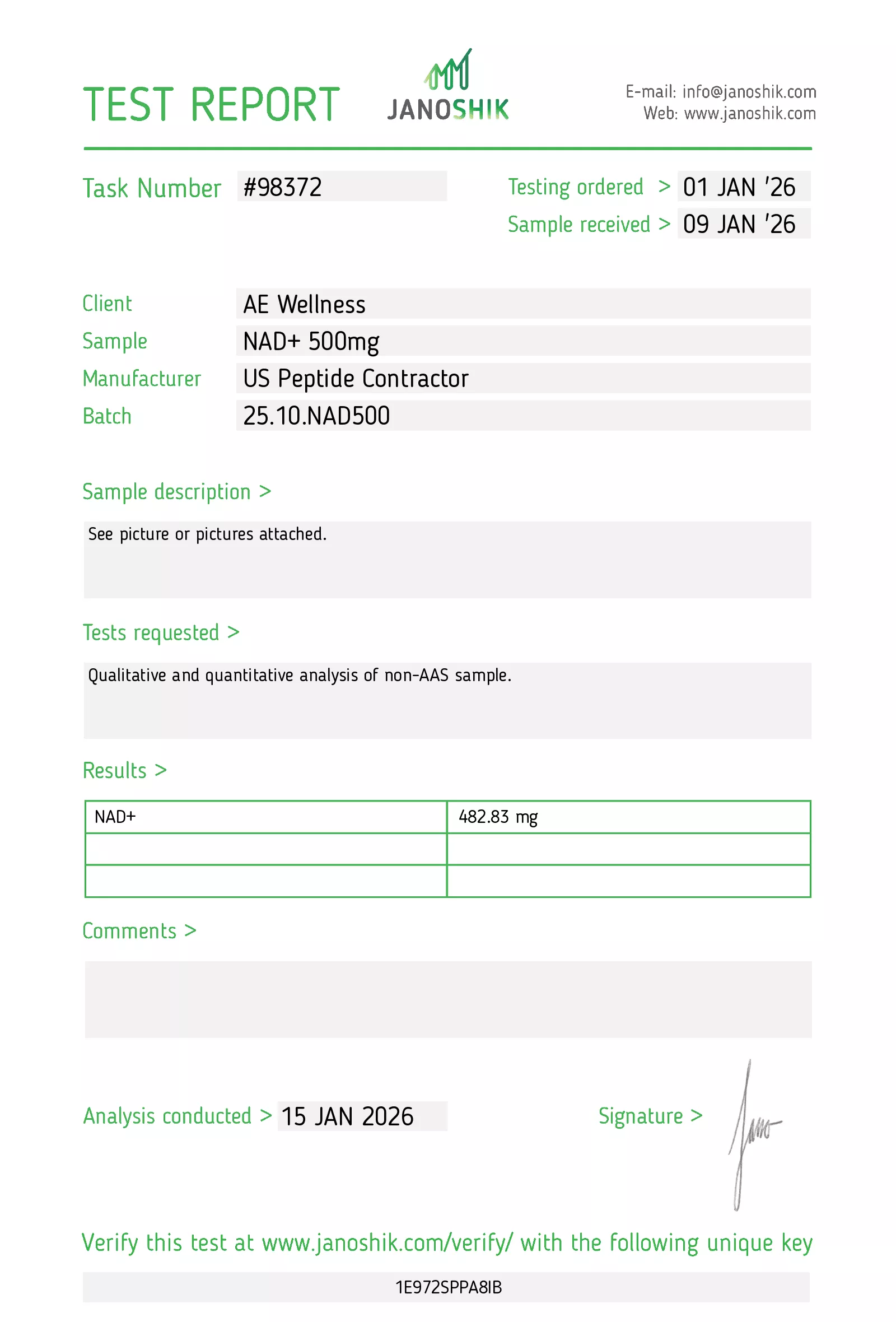 NAD+ is a coenzyme that supports cellular energy production and promotes healthy aging. It boosts metabolism, enhances brain function, and promotes overall vitality by supporting mitochondrial function and cellular repair.